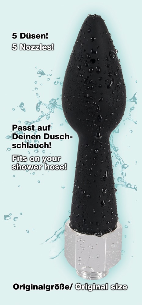 Wystarczy przykręcić wąż prysznicowy do gwintu śruby natrysku intymnego i gotowe: Powoli aksamitnie miękka powierzchnia stożkowej wtyczki wykonanej z czarnego silikonu przesuwa się do miejsca przeznaczenia w celu intymnego oczyszczenia. Woda tryska z pięciu otworów, z których jeden znajduje się w końcówce korka, w zależności od intensywności strumienia natrysku.