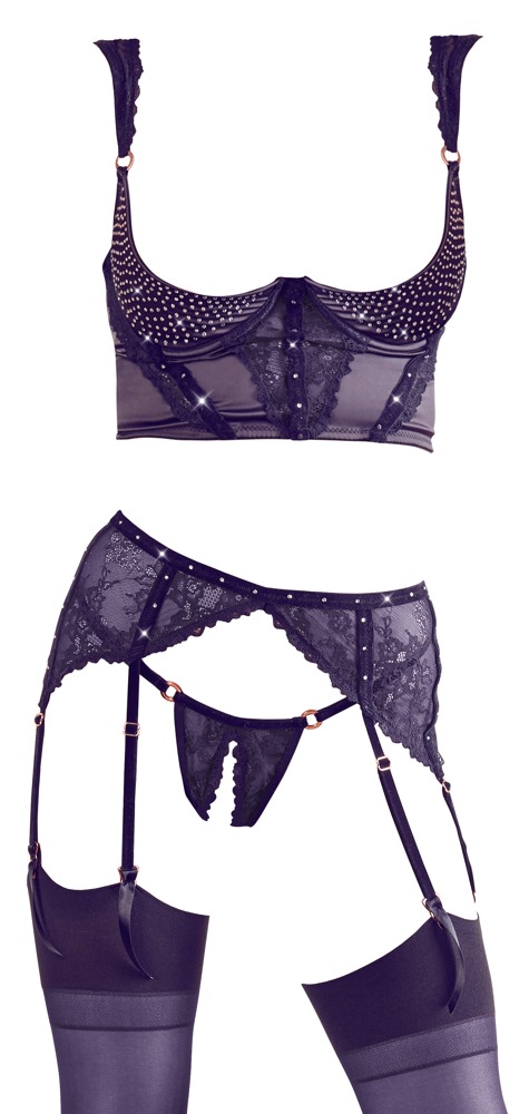 Szlachetny 3-częściowy zestaw koronek i elementów aksamitnych. Podnośnik na biust jest wyposażony w lekko wyściełane fiszbiny i ozdobiony kamyczkami i aksamitnymi wstążkami. Koronkowe wstawki z przodu i paski nadają eleganckiego wykończenia. Stringi bez krocza i szelki z 6 szelkami są prawie wyłącznie wykonane z koronki, ale również ozdobione aksamitnymi wstążkami. Klamry podwiązki są pokryte szlachetną, satynową wstążką. Bustier ma zapięcie na długi hak, a pas do podwieszania jest zamknięty z tyłu klamrą.