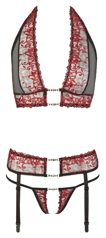 Trzyczęściowy zestaw do szelki, w skład którego wchodzi braletka na szyję z zapięciem klipsowym, pasek do szelki z zapięciem z tyłu na haczyk oraz regulowane szelki i stringi całkowicie bez krocza. Zrobione z czarnej siatki Powernet. Od dekoltu do krocza z czerwonym błyszczącym haftem. Z ciągłym otwartym frontem, połączonym 5 elementami dżetowymi. 100% poliamid.