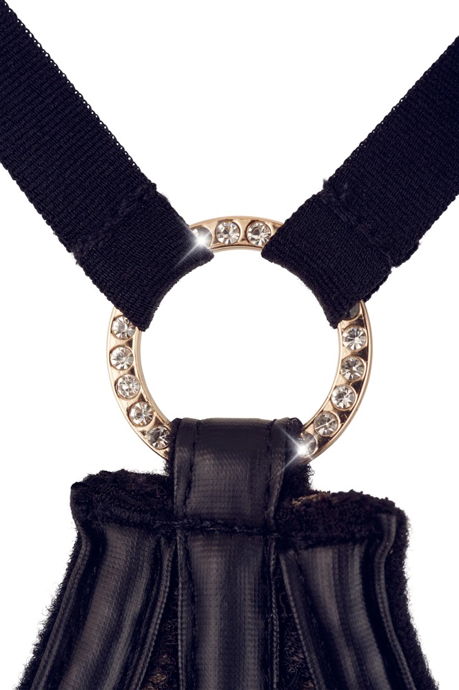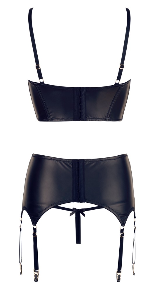 Czarny, trzyczęściowy komplet do pończoch z detalami w kolorze złota to wykwintny strój uwodzicielski. Biustonosz na fiszbinach, zapinany na haftki, z całkowicie otwartymi miseczkami, dzięki wąskim ramiączkom podkreśla biust. Szeroka taśma pod biustem z wbudowanymi paskami wykonana jest z matowo-błyszczącego materiału z koronkowymi wstawkami. Nieco szersza podwiązka również posiada zapięcie na haftki, koronkowe wstawki, kusi 3 paskami podwiązki z każdej strony oraz małym ozdobnym sznurowaniem z przodu. Pasujące koronkowe stringi są zachęcająco otwarte w kroku. Szelki, ramiączka i szelki regulowane.