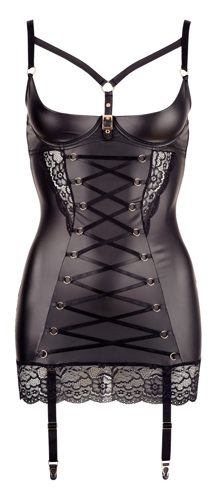 Podkreślająca sylwetkę sukienka bieliźniana z lekko podszytym dołem i paskami. Z przodu sznurowanie i ozdobny pierścień. Szlachetne koronkowe wstawki z przodu i u dołu sprawiają, że seksowny wygląd jest perfekcyjny. Regulowane paski. Paski i szelki regulowane i odpinane. Metalowe detale w kolorze złotym.