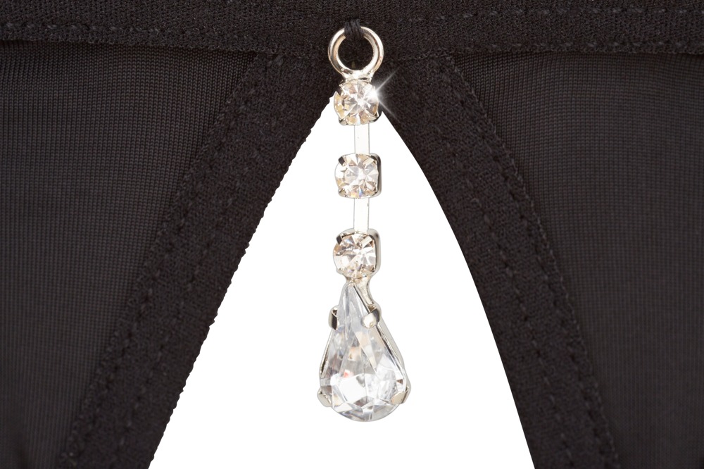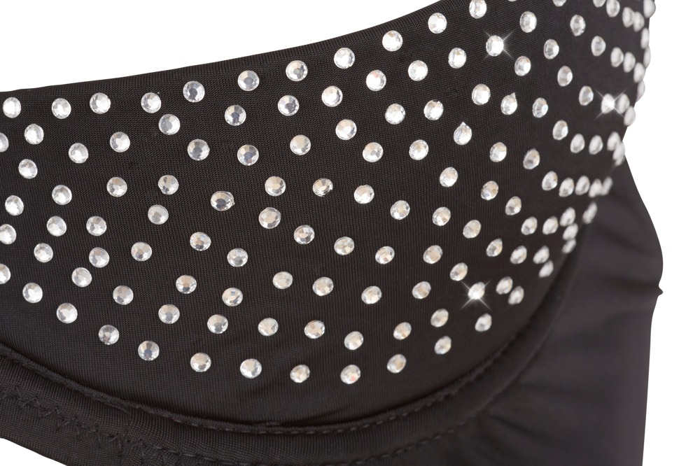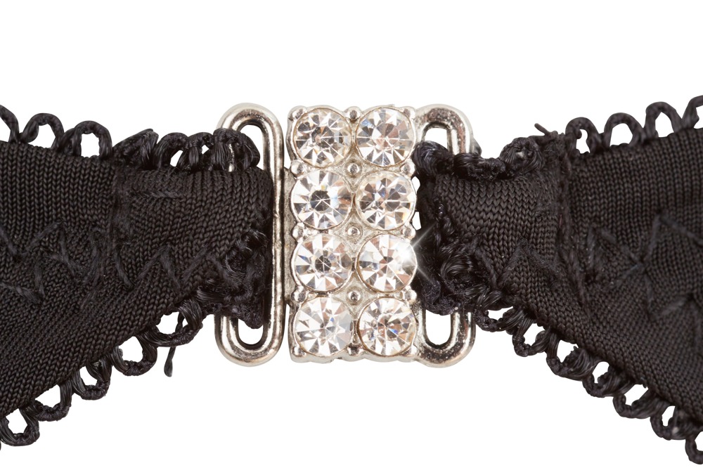 Podwyższenie na fiszbinach z zapięciem na haftki przekonuje zdobionymi dżetami, lekko podszytymi miseczkami, pomiędzy którymi połyskuje detal z dżetów. Szlachetna biżuteria z dżetów znajduje się również przy zapięciu pasa do pończoch oraz przy stringach, które wabią zachęcająco otwartym kroczem. Paski i szelki regulowane.