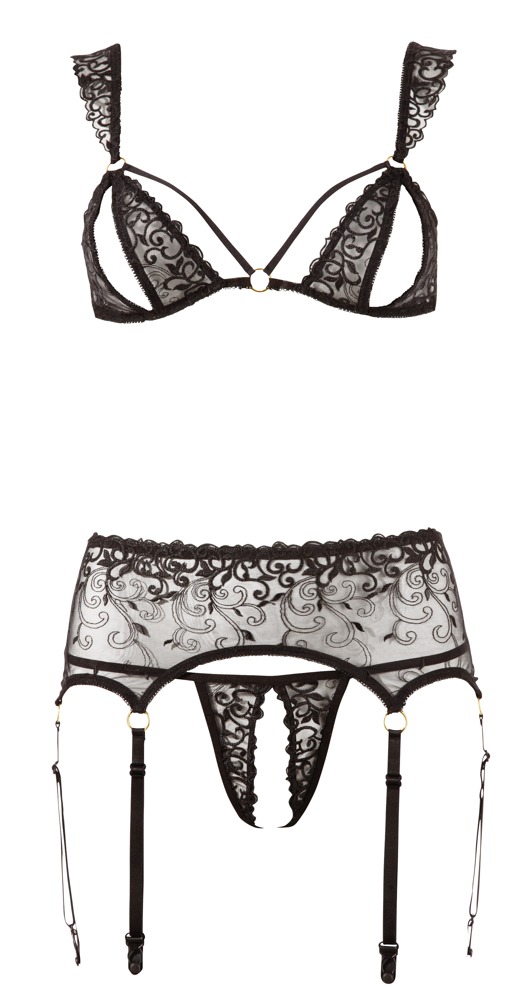 W komplecie z podwiązkami z pięknie haftowanego tiulu, pełne zainteresowanie jest gwarantowane. Miękki biustonosz z otwartymi miseczkami nadaje głębi i wygląda olśniewająco nie tylko dzięki regulowanym ramiączkom z tiulowym wykończeniem. Dzięki zapięciu na zatrzask z tyłu, biustonosz jest łatwy do rozpięcia. Szeroki pas na szelki mieści 6 regulowanych szelek i zamyka się z tyłu na szeroki haczyk. Otwarte stringi stanowią dopełnienie kompletu.