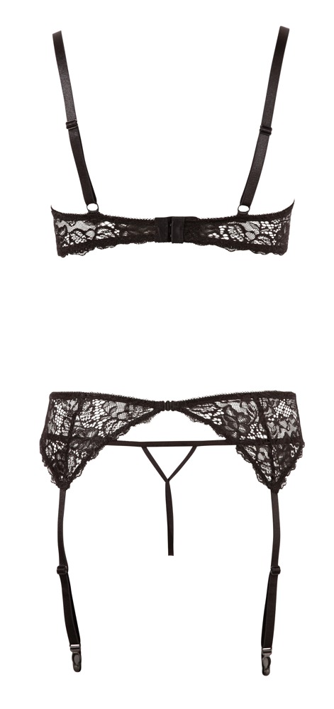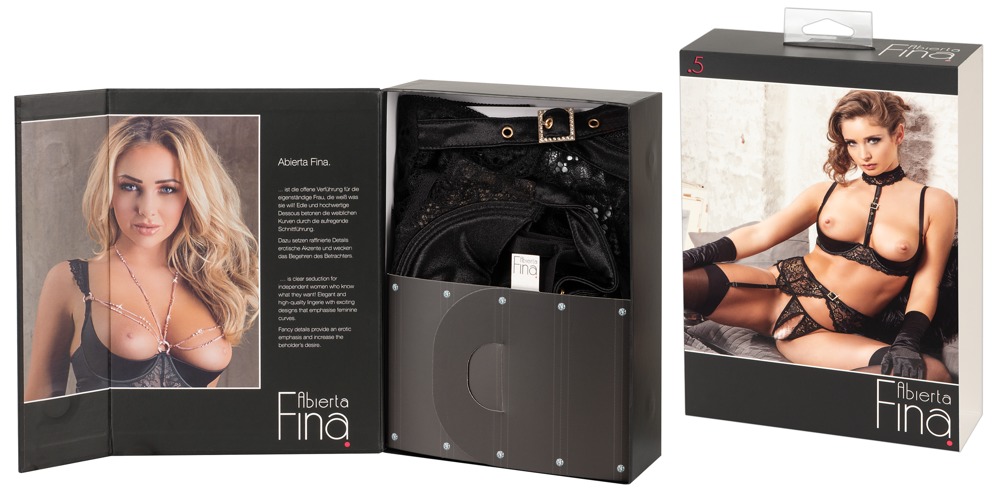 Ten 3-częściowy zestaw składający się z fiszbin, pasa do pończoch i stringów bez krocza jest wykonany głównie z koronki i zyskuje ekstrawagancki wygląd dzięki dwóm paskom zapinanym na klamerki w fetyszowym stylu. Kołnierzyk można zapiąć z tyłu na dwa guziki i jest on mocno połączony z lekko usztywnianymi fiszbinami. Biustonosz i pas do pończoch zapinany z tyłu na haftki. Paski i szelki regulowane.