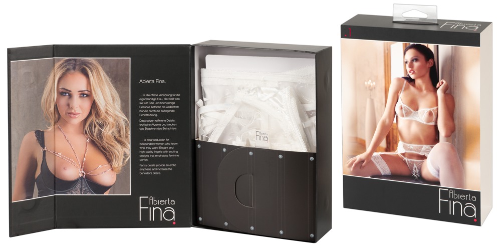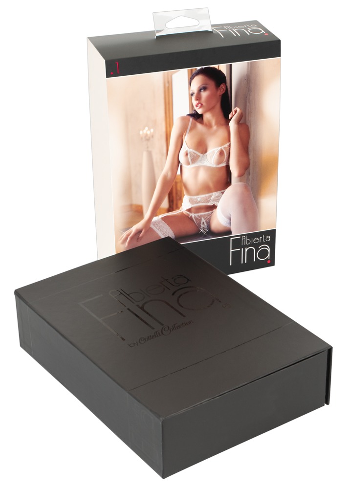 Delikatny komplet wykonany z haftowanej drobnej siateczki w połączeniu z elastyczną satyną i drobnym ozdobnym sznurowaniem. Biustonosz na fiszbinach z rozciętymi miseczkami i regulowanymi ramiączkami. Pasek z regulowanymi szelkami, z tyłu zapięcie na haftkę. Pasujące stringi z otwartym kroczem.