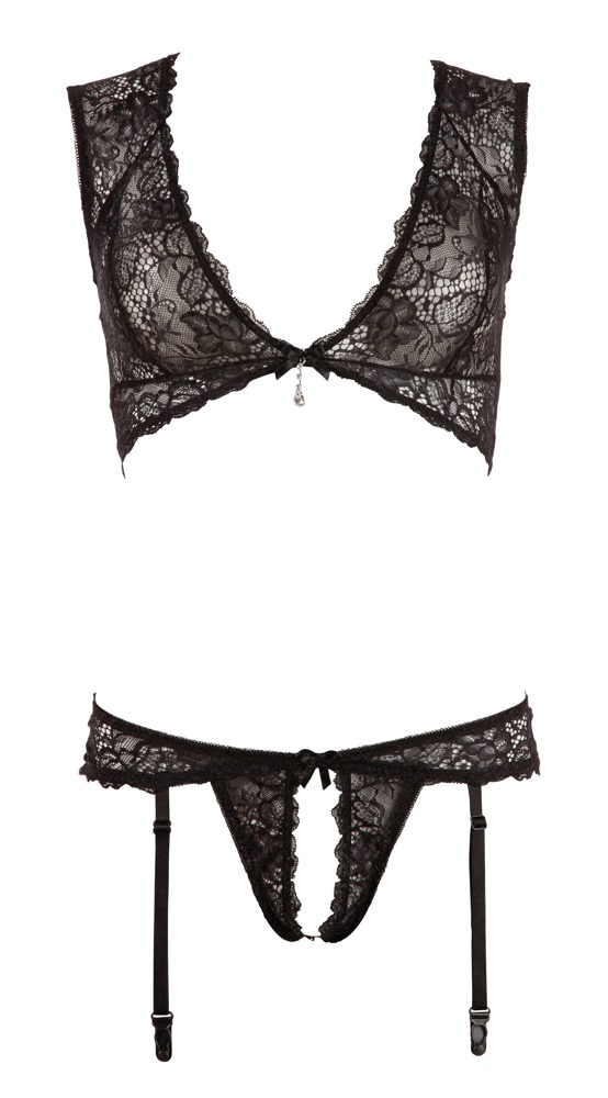 Biustonosz i stringi do pończoch wykonane z koronki. Biustonosz z ozdobą z dżetów przy głębokim dekolcie. Stringi z czterema regulowanymi szelkami, z tyłu zapięcie na klips. Otwarte w kroku.