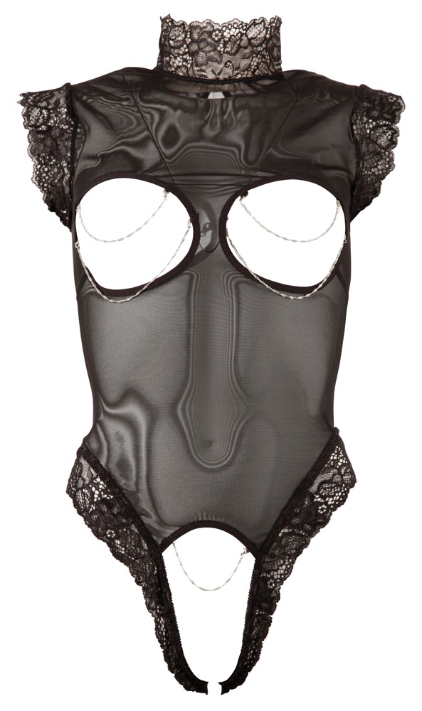 Czarny przezroczysty korpus z koronkowymi wykończeniami na ramionach, kołnierzykiem (2 guziki z tyłu) i wycięciami na nogi. Piersi i wstyd są otwarte i ozdobione zdejmowanymi łańcuchami. 90% poliamid, 10% elastan.