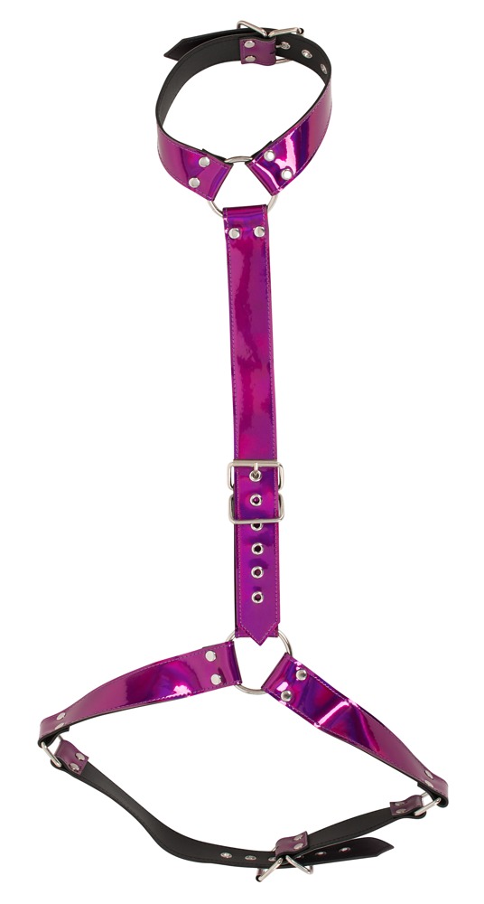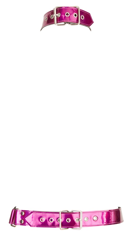 Najgorętsza rzecz na gołej skórze: fuchsia metalowa klamra opalizująca, noszona wokół szyi i talii. Wszystkie trzy paski (szyja, przód, talia) są indywidualnie regulowane w celu zapewnienia idealnego dopasowania.