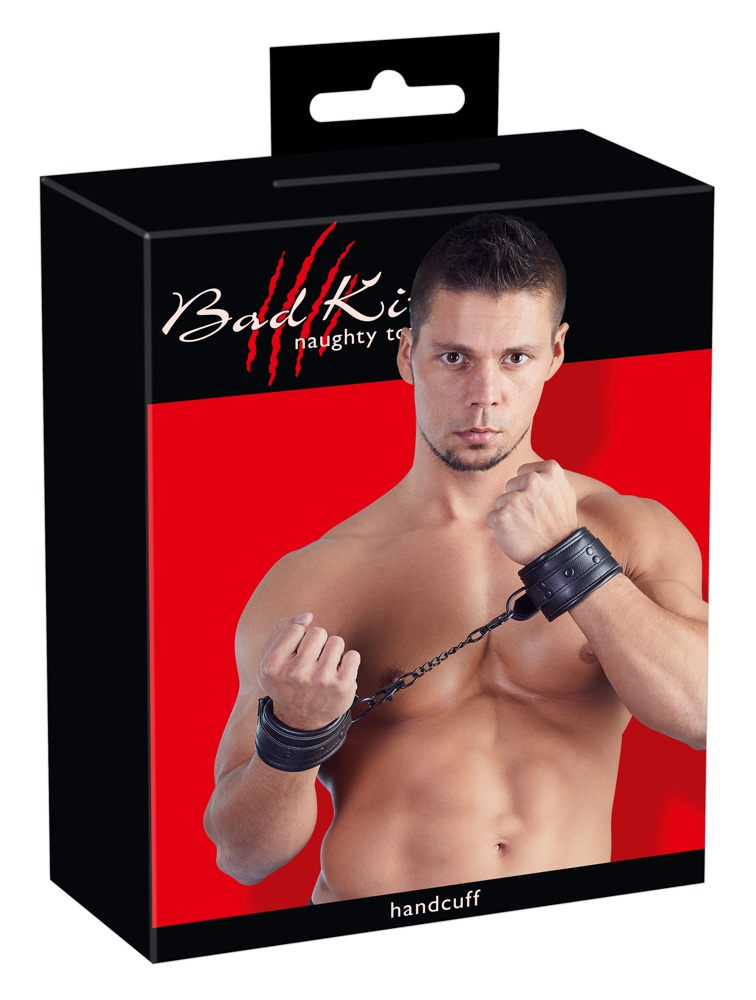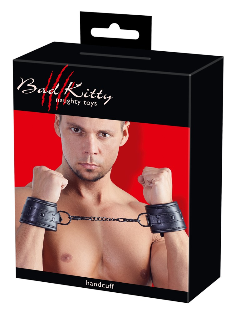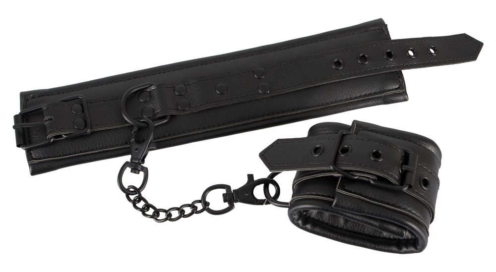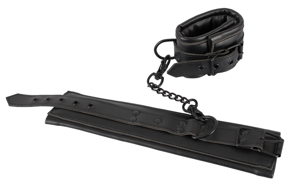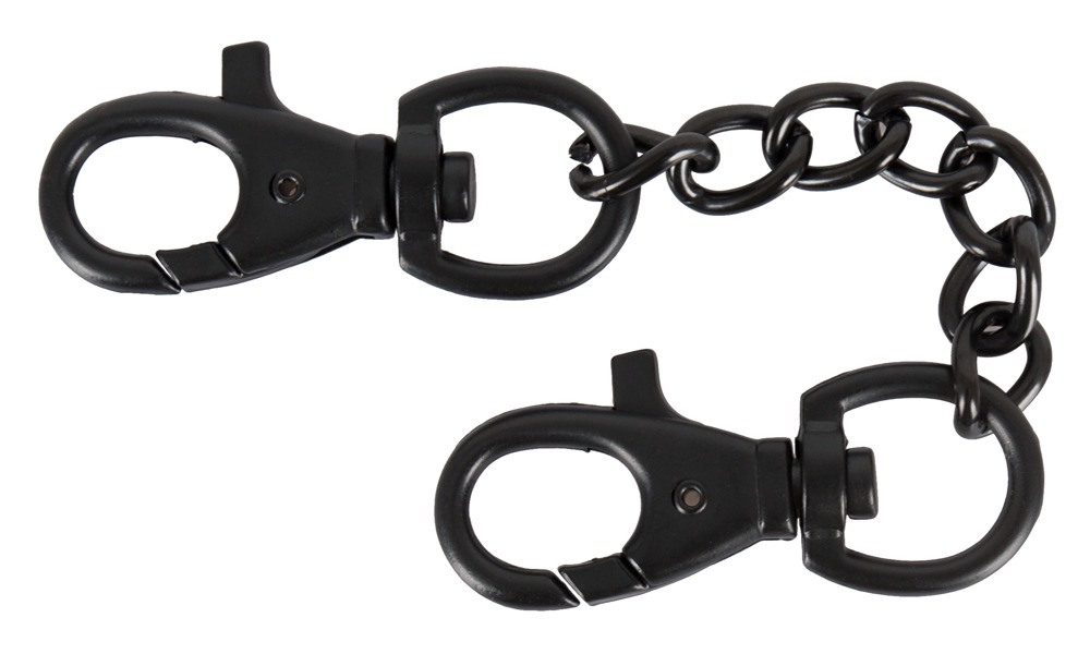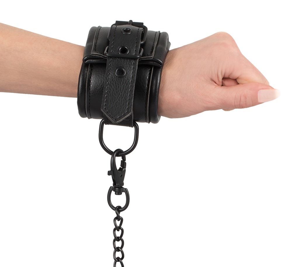 Miękko wyściełane kajdanki wykonane z imitacji skóry z zapięciem na klamrę (obwód 18 do 28 cm). Krótki metalowy łańcuch z karabinkami (całkowita długość 16 cm) do łączenia kajdanek. Łańcuch, klamra i nity lakierowane matowo.