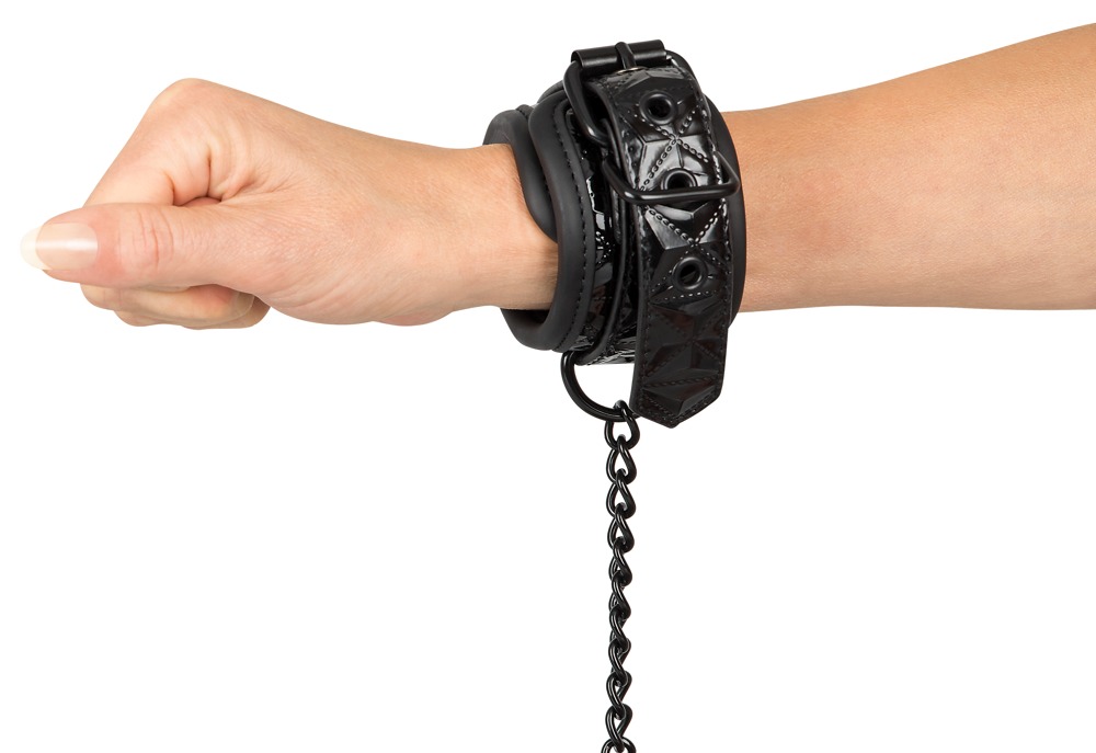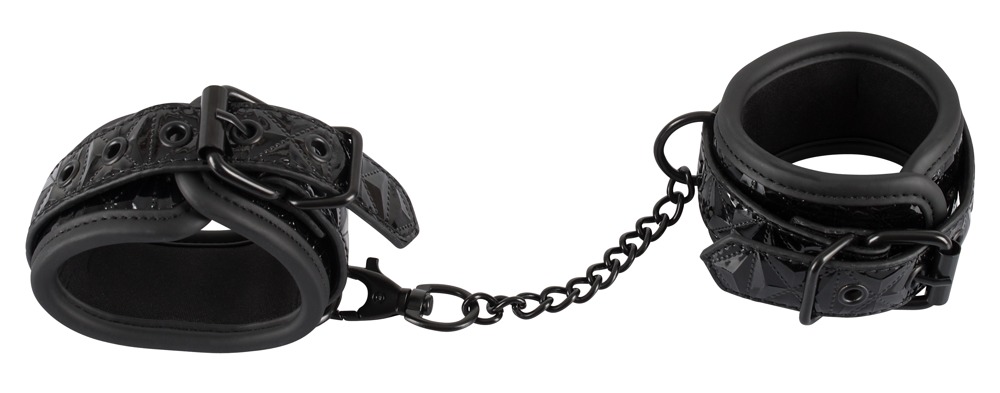 Czarne kajdanki dla erotycznej swobody ruchów - załóż swoje skarby na lekko wyściełane mankiety z obrzeżami i wiadomo kto tu rządzi. Mankiety są połączone szlachetnym, matowo-czarnym łańcuszkiem łączącym z karabinkiem. Ale nie tylko funkcjonalne, ale również optycznie te kajdanki są ozdobą, ponieważ wytłoczona powierzchnia ma diamentowy wygląd - wow-efekt gwarantowany!