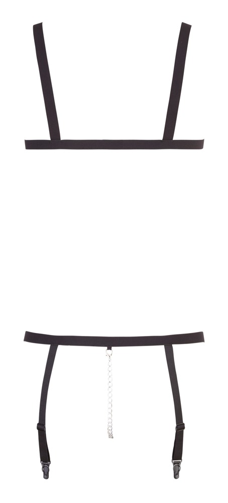 Ta wyrafinowana 2-częściowa uprząż wykonana z plecionej gumki z ozdobnymi oczkami punktuje 4 szelkami, do których w razie potrzeby można przypiąć uwodzicielskie pończochy. I: Przez krocze przechodzi metalowy łańcuszek, który przy każdym ruchu daje o sobie znać... Bez pończoch.