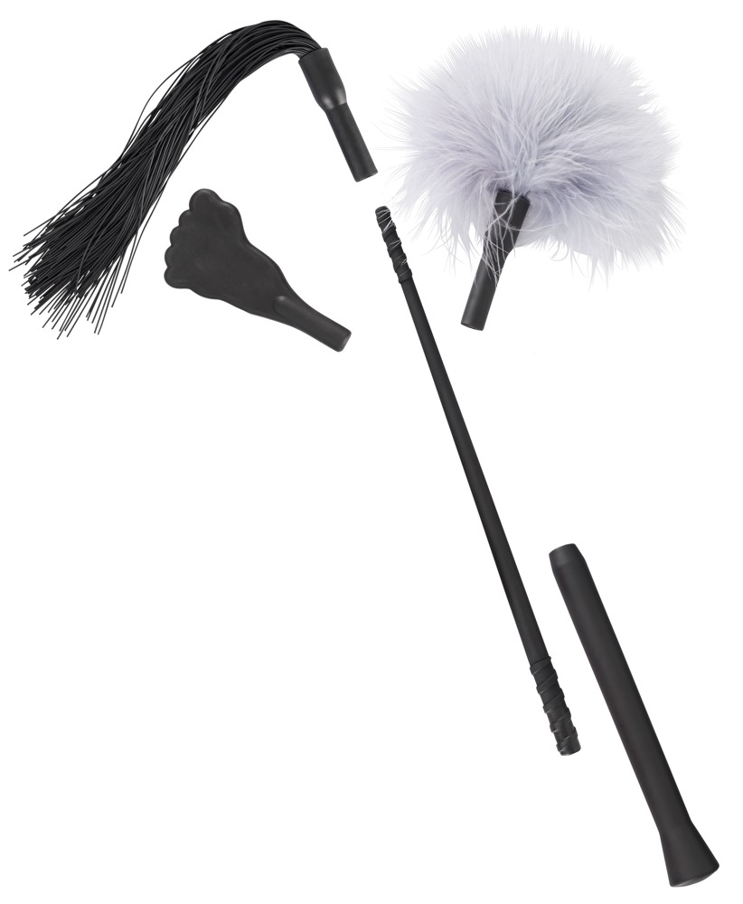 Z tym zestawem mini biczów, gry z mrowieniem są zaprogramowane! W zależności od nastroju można przykręcić 3 różne przystawki do zmontowanego plastikowego patyczka (40 cm długości). Czy wolisz puszyste srebrno-szare piórko tuft, czy raczej małą, płaską stopę, czy raczej mini bicz z drobnymi paskami? Do czegokolwiek zmierzasz, z tym zestawem każdy dostanie swoje erotyczne pieniądze! Czarny.