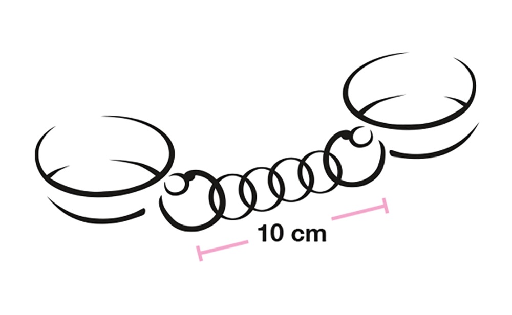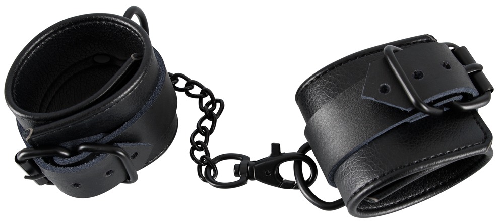 Czarne kajdanki w wyglądzie skóry z krótkim łańcuszkiem łączącym (10 cm długości). Poliuretan, metal.