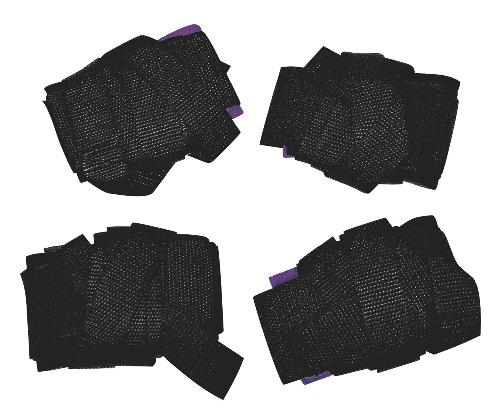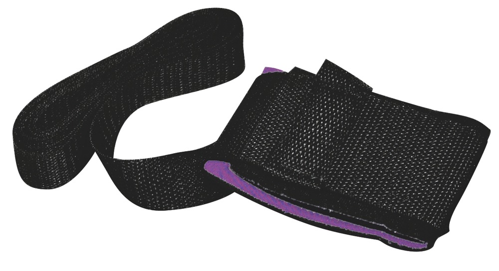 Dwa kajdanki i dwa kajdanki na nogi z zapięciem na rzep. Łącznie z każdym paskiem o długości 115 cm. Barwiony na czarno/liakowo, 100% poliamid.