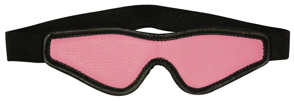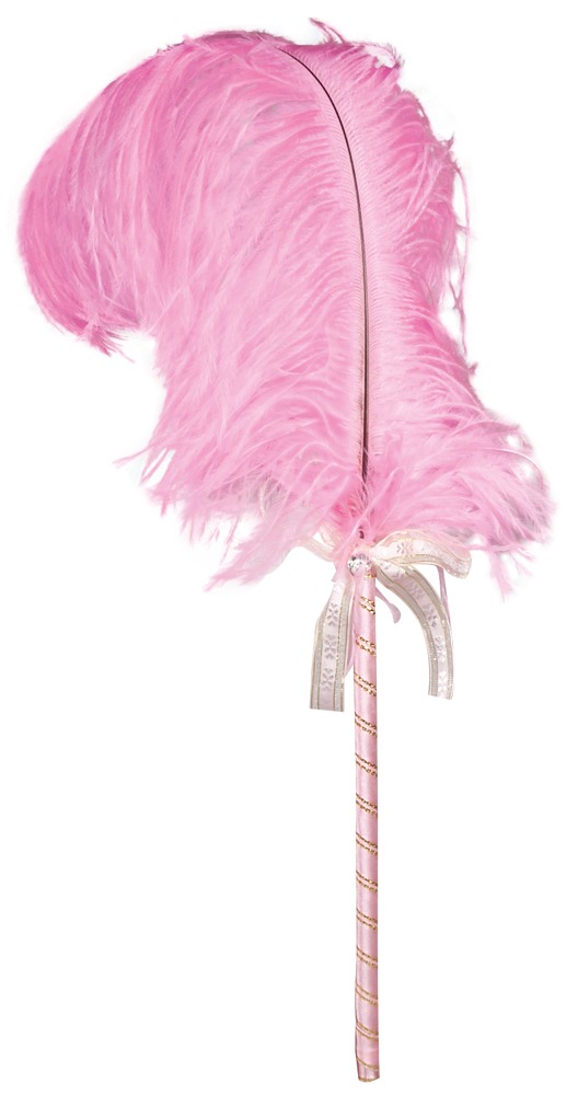 Różowo-czarny zestaw fetyszy składający się z strusiego pióra, maski pod oczy, kajdanek na rzep z krótkim łańcuszkiem łączącym, małego zamszowego biczyka i wiosła.