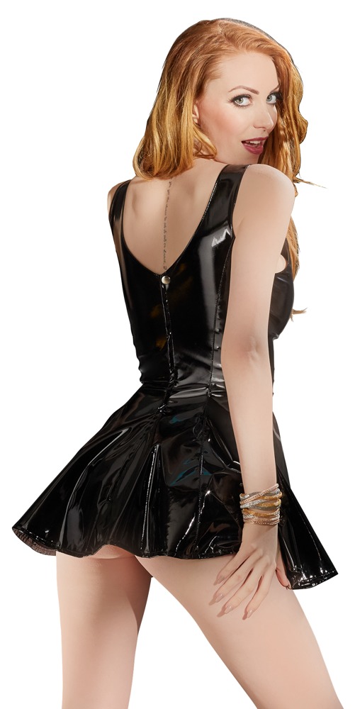 Ta czarna winylowa mini sukienka z rozszerzaną częścią spódnicy i suwakiem z tyłu urzeka z przodu i z tyłu niskim dekoltem.