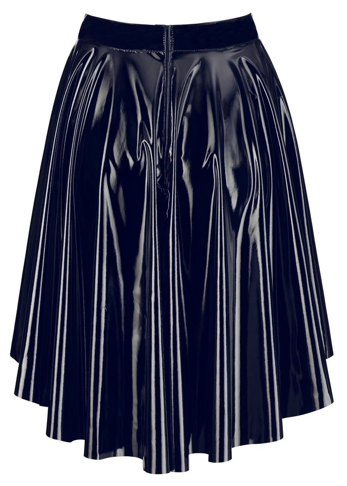 Lekko rozpalona spódnica z błyszczącego winylu. Z ekscytującym fasonem ściółki, dzięki czemu spódnica jest krótsza z przodu niż z tyłu. Pochlebcający figurze wszechstronny, który można łączyć na wiele sposobów.