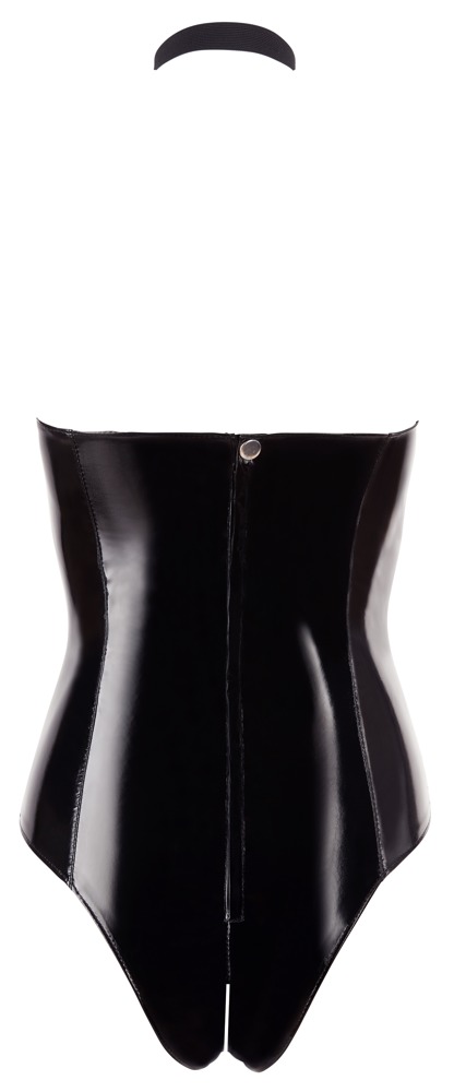 Body winylowe z dekoltem typu halterneck i wyrafinowanym sznurowaniem z przodu aż do otwartego kroku. Z tyłu zamek błyskawiczny i guzik.