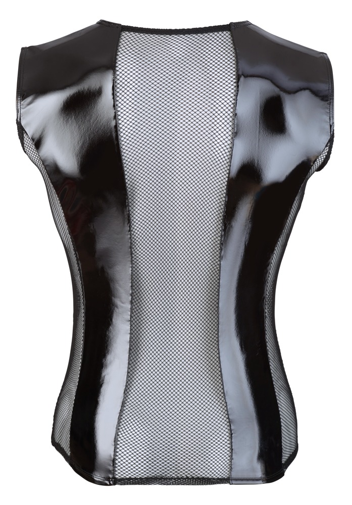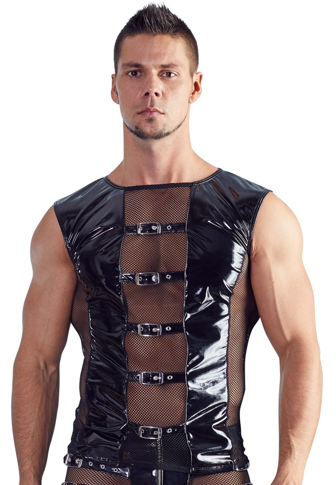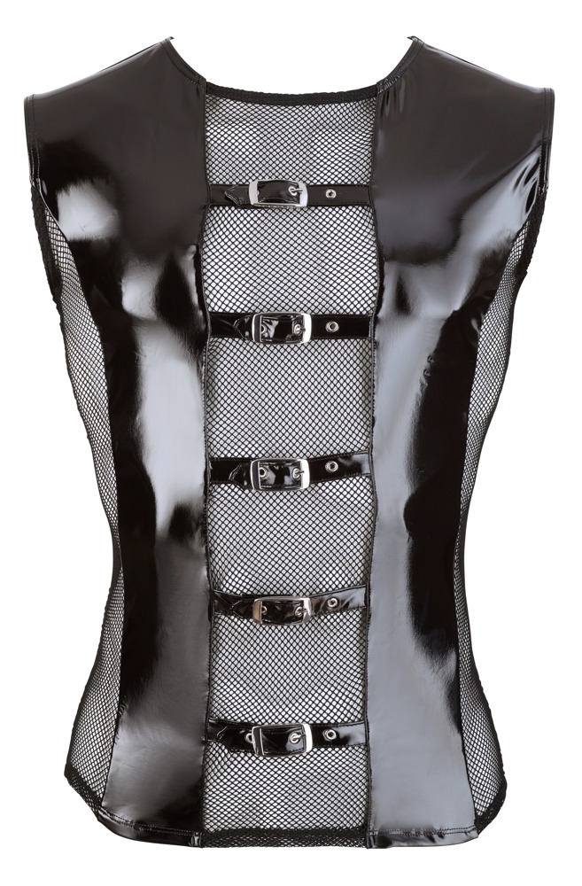 Błyszcząca koszulka wykonana z bi-elastycznego winylu z siateczkowymi wstawkami z przodu i z tyłu. Wygodne w noszeniu i z 5 stylowymi paskami z klamrami z przodu. Absolutny niezbędnik w każdej fetyszowej szafie!
