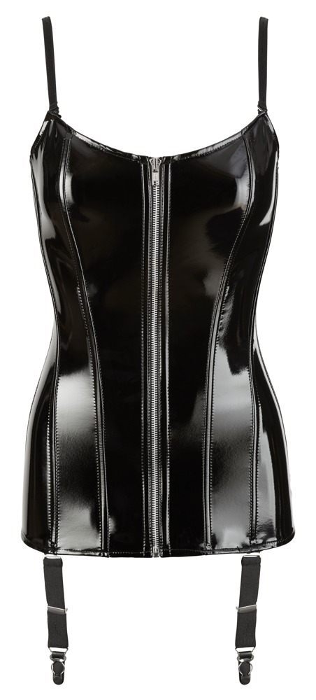 Czarny patentowy gorset na szelkach z formującymi pręcikami, z przodu zamek błyskawiczny, z tyłu ozdobne sznurowanie. Możliwość odpięcia pasków i szelek. Bez pończoch.