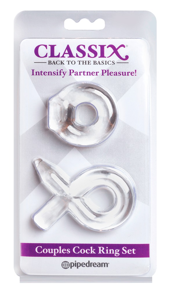 2 pierścienie na penisa w różnych kształtach z stymulatorem łechtaczki. Idealne dla początkujących w świecie pierścieni na penisa, ponieważ są niezwykle elastyczne. Mogą być naciągane na penisa pojedynczo lub razem.