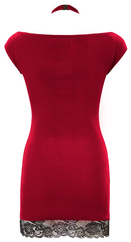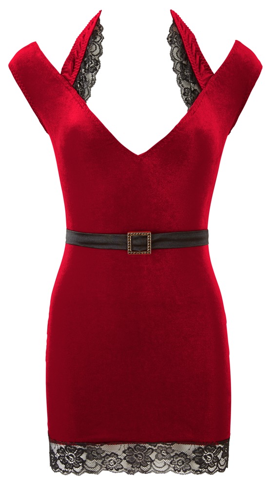Czerwona, przytulnie miękka, aksamitna mini sukienka w obcisłym kroju z ekscytującym dekoltem. Z czarną koronkową lamówką na uchwycie na szyję (z zapięciem klipsowym) i obszyciem. Z przodu czarny satynowy pasek z ozdobną klamrą w kolorze złotym. Fantastycznie elastyczny i przytulny z wysokim komfortem noszenia.