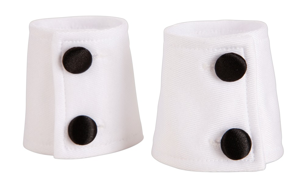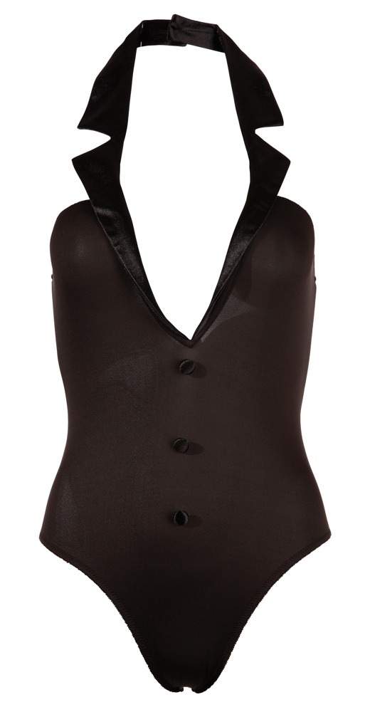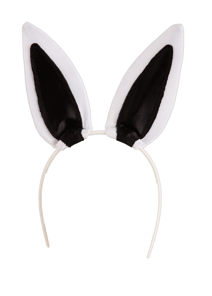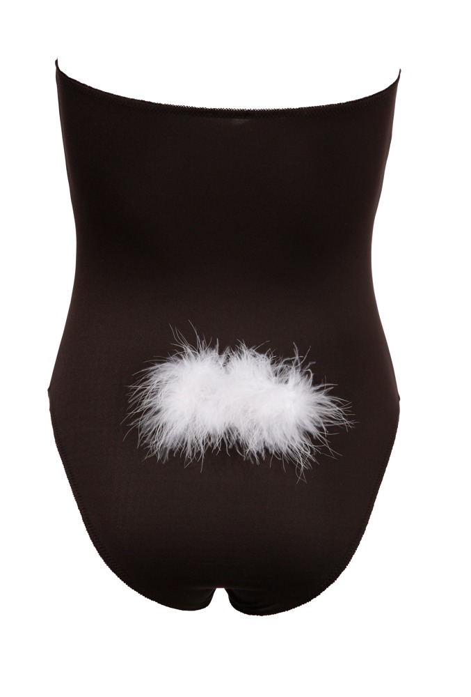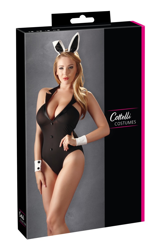Czarne body z niskim dekoltem, kołnierzykiem i trzema guzikami z przodu, oferuje również seksowny widok z tyłu dzięki dekoltowi typu halter. Zdejmowana biała pufa z piór na pupie jest tutaj prawdziwą gwiazdą. W zestawie znajdują się również zginane białe mankiety na ręce z czarnymi guzikami oraz opaska na włosy z czarno-białymi uszami króliczka.
