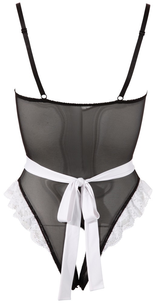 Body wykonane z powernetu z koronkowym zdobieniem. Z regulowanymi ramiączkami oraz regulowanymi i odpinanymi szelkami. Otwarte w kroku. W komplecie kołnierzyk z muszką i zapięciem na rzep oraz fartuszek do zawiązania.