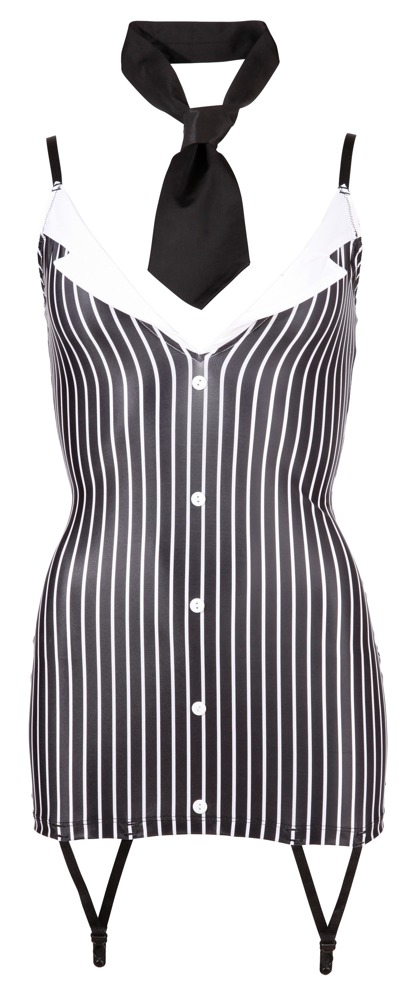 Obcisła mini sukienka z regulowanymi ramiączkami i dwoma szelkami z przodu. Z przodu zapinana na guziki, przy głębokim dekolcie wskazany kołnierzyk. W tym krawat do krawata.