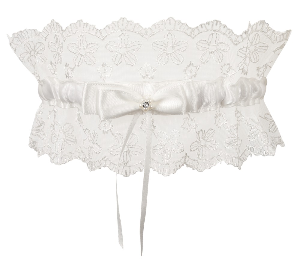 Biała podwiązka z haftem o szerokości ok. 9 cm, elastyczną satynową taśmą oraz brokatowym kamieniem i kokardką.