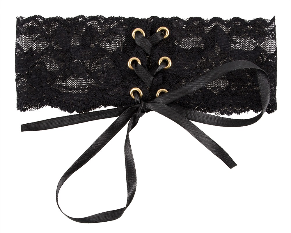 Piękny naszyjnik wykonany z czarnej koronkowej tasiemki, z 6 oczkami i sznurowaniem z satynowej tasiemki do zapinania i regulowania długości. Zapięcie może być noszone z tyłu lub z przodu.