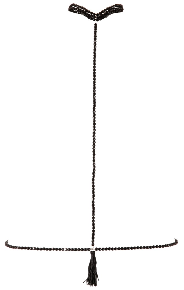 Elastyczny, trzyrzędowy naszyjnik z pereł na szyję - połączony drugim łańcuszkiem z naszyjnikiem bikini, który można zapiąć z tyłu za pomocą małego karabinka. Z przodu na brzuchu znajduje się mała pufa z grzywką.