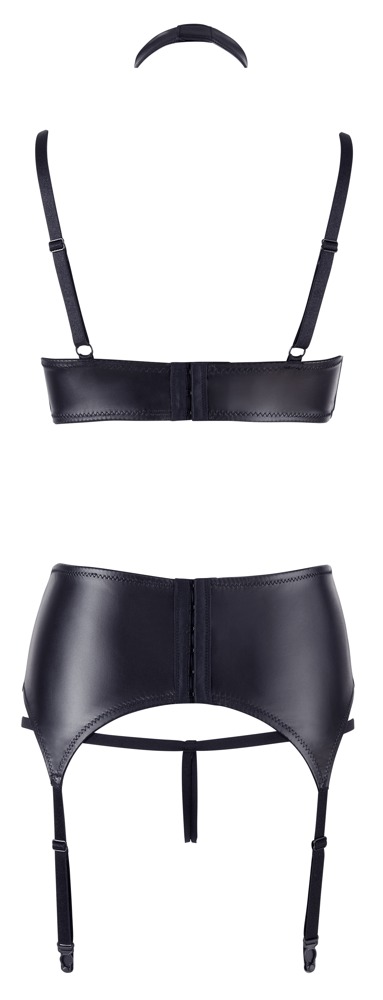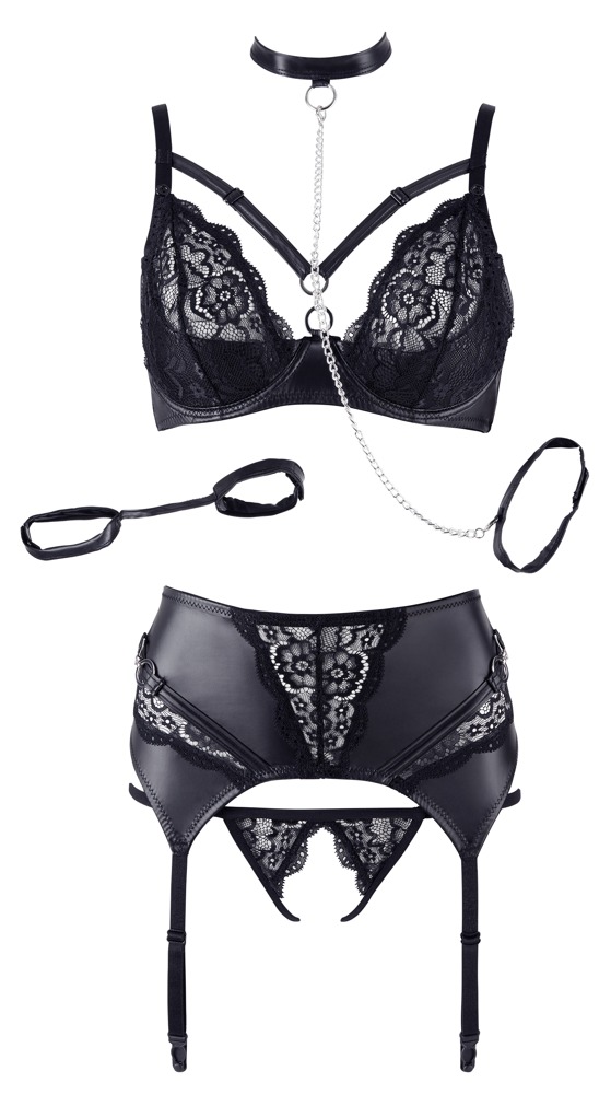 Ten 3-częściowy zestaw do zawieszania łączy w sobie szlachetny, matowy wygląd z delikatną kwiatową koronką. Misternie zaprojektowany biustonosz fiszbinowy urzeka regulowanymi detalami ramiączek i ozdobnymi obrączkami na dekolcie. Koronkowe miseczki można w tym celu złożyć, pozostawiając w mgnieniu oka lekko podszytą windę. Pasujący pasek do szelki posiada regulowane szelki i przynęty z przodu w srebrnym kolorze ozdobnych pierścieni i koronkowych wstawek. Zawiera w pełni bez krocza stringi, które obramowują obszar łonowy za pomocą tylko dwóch elastycznych pasów, kajdanki (Velcro) z krótkim pasem łączącym i kołnierzem (Velcro) oraz smycz prowadzącą.