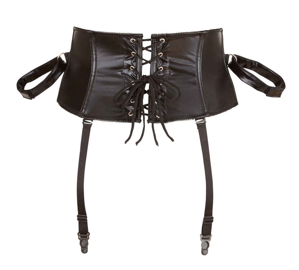 Gorset wetlook bez biustu z paskami modelującymi sylwetkę. Wyrafinowane w każdym szczególe, z zamkiem błyskawicznym i sznurowaniem z przodu oraz dodatkowym sznurowaniem z tyłu. W zestawie 2 mankiety na ręce z rzepem i 1 maska na oczy dla wielu wciągających pomysłów na zabawę.