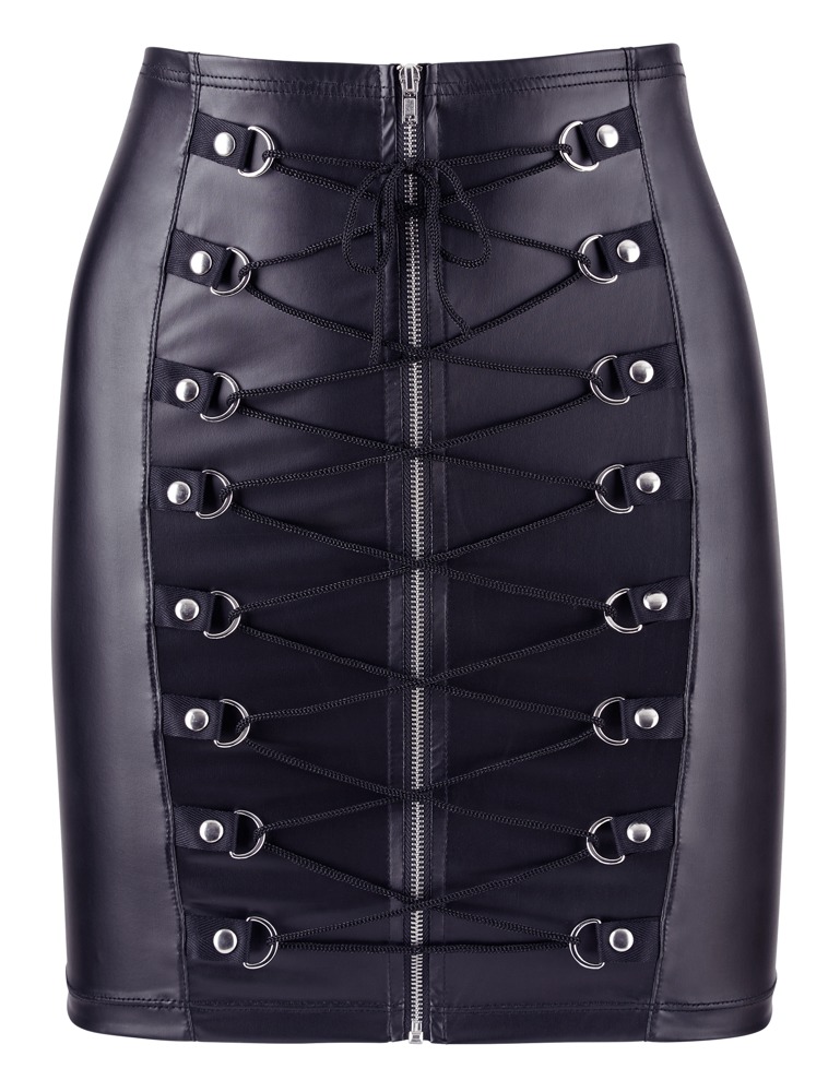 Mini spódniczka w ekscytującym czarnym matowym kolorze z zamkiem błyskawicznym na całej długości pod wyszukanym sznurowaniem, które można nosić zarówno z przodu, jak i z tyłu.