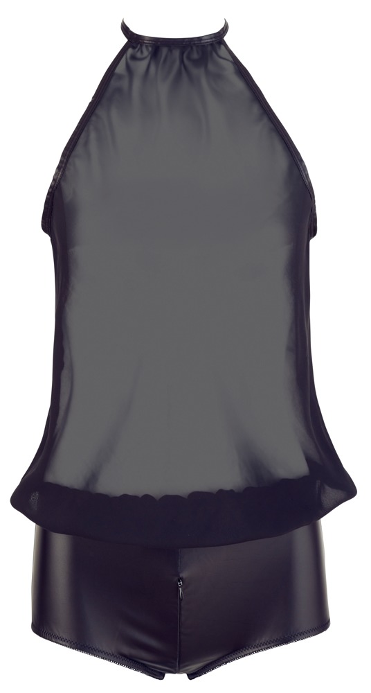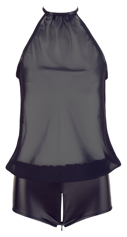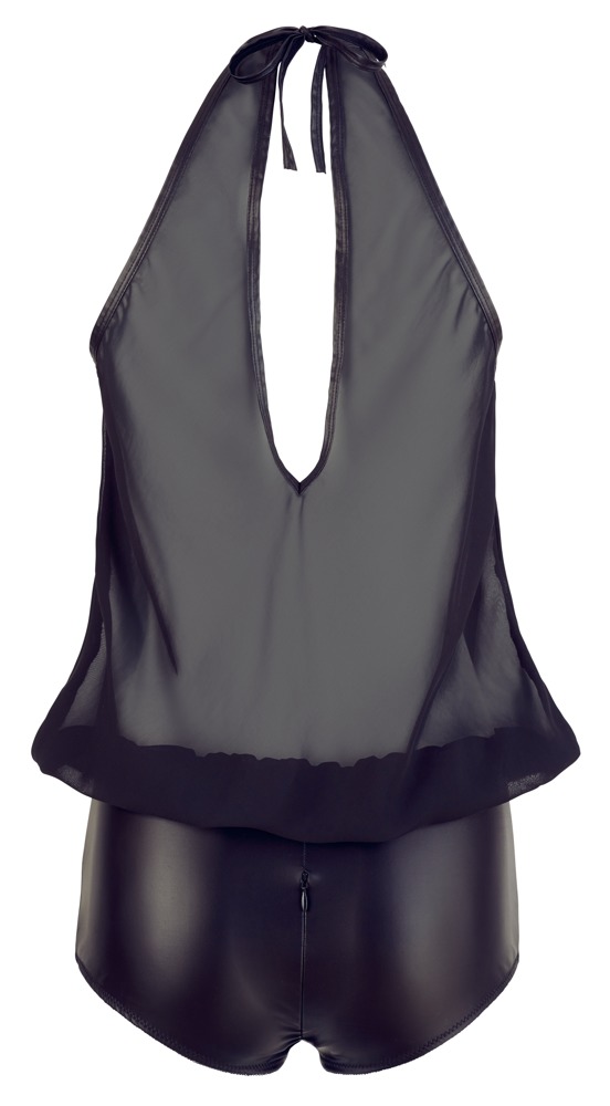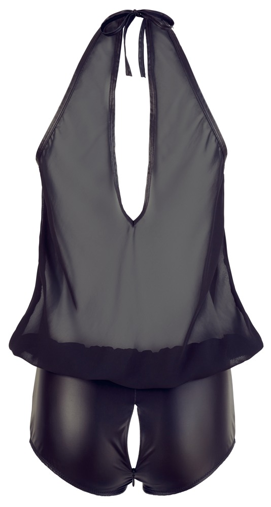Przezroczysty szyfonowy korpus z szerokim wycięciem na szyję, który jest zamknięty na szyi kokardką z krawatem. Matowa, lśniąca, obcisła część majteczek z wyszukanym 2-kartkowym zamknięciem w kroczu.