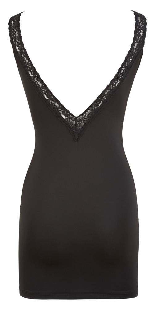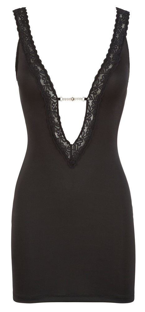 Ciasno skrojona mini sukienka z głębokim dekoltem z przodu i z tyłu. Z elastyczną koronkową opaską jako ramiączka, która wpada w dekolt jako zewnętrzna krawędź z przodu i z tyłu. Mały łańcuszek z dżetu w dekolcie harmonijnie dopełnia strój.
