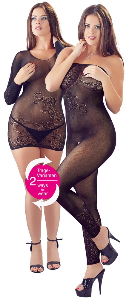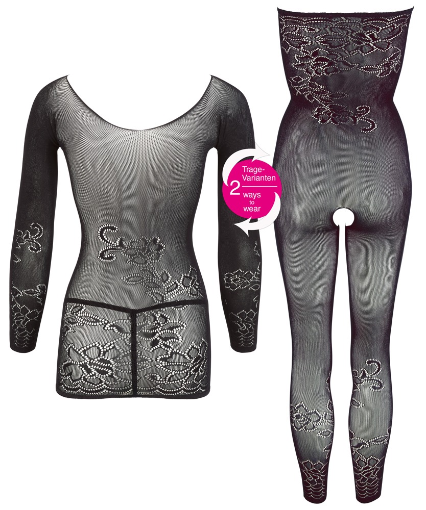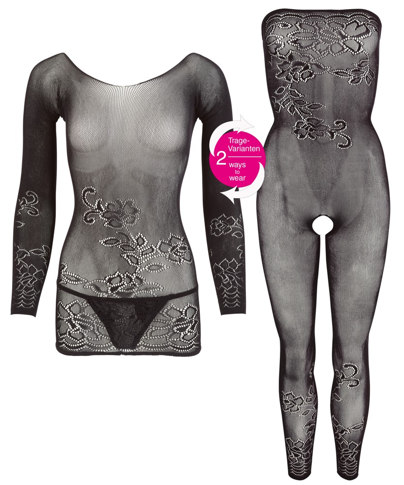 Bezszwowy, jednoczęściowy kostium, który może być noszony zarówno jako kostium ouvert z rurką, jak i minisukienka z długim rękawem. Półprzezroczyste z kwiatową koronką. Wygodna w noszeniu dzięki dużej zawartości spandexu. W komplecie koronkowe stringi.