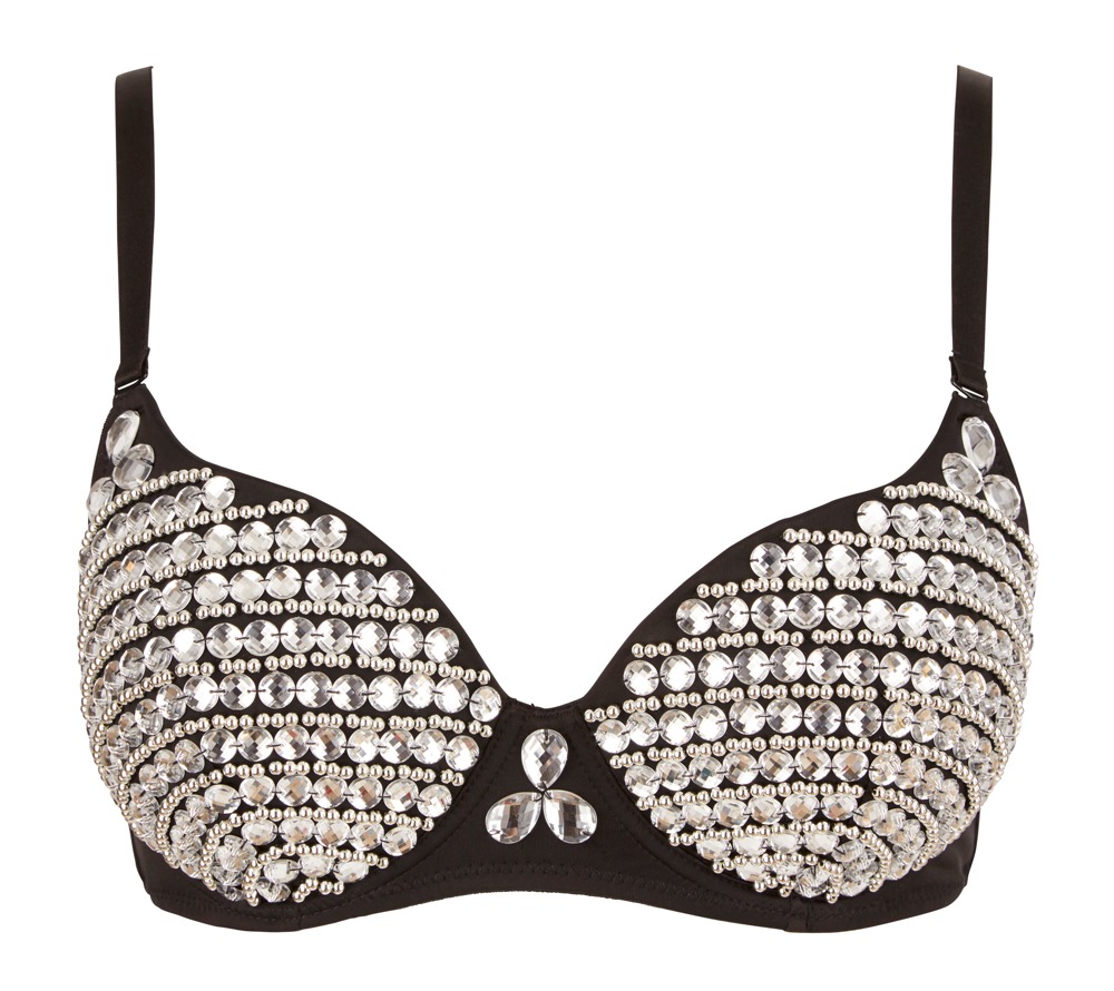Biustonosz na fiszbinach z lekko usztywnianymi miseczkami wysadzanymi perłami i kamieniami. Po bokach małe paski, z tyłu zapięcie na haftkę. Ramiączka regulowane i odpinane.