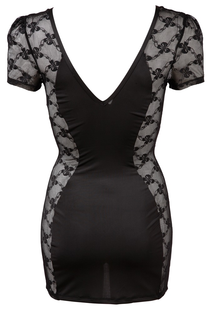 Obcisła, prześwitująca sukienka bieliźniana, po bokach wykonana z delikatnej koronki. Z krótkimi rękawami oraz głębokim dekoltem z przodu i z tyłu. Dwukierunkowy zamek błyskawiczny z przodu sprawia, że seksowny wygląd jest perfekcyjny.