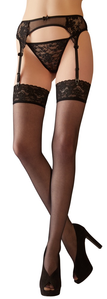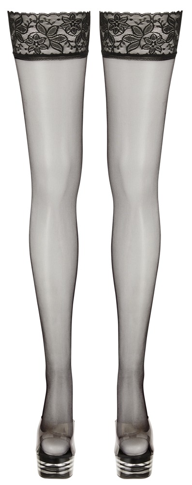 Zmysłowe pończochy do podwieszania z koronkową obwódką o szerokości 8 cm. 20 den. Nieco wstępnie ukształtowana stopa. Certyfikat Oeko-Tex.