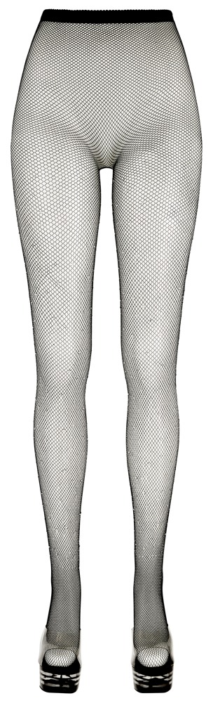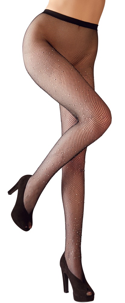 Czarne rajstopy siatkowe z elastyczną talią i wzmocnioną częścią palcową są zapinane na różne wielkości błyszczące kamienie od kostki do uda - to naprawdę przyciąga wzrok!
