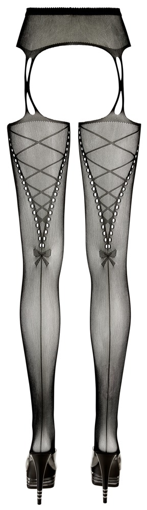 Jedwabiste rajstopy do pończoch w wyrafinowanym wyglądzie pasa do pończoch. Wykonane z drobnej siatki z tkanym wzorem na plecach.