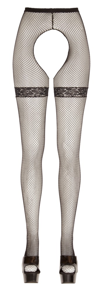Rajstopy do pończoch wykonane z grubej siatki z wszytymi koronkowymi paskami do pończoch. W kroczu zapraszająco otwarte.
