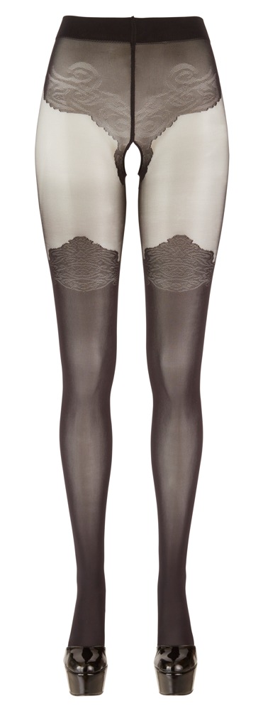 Te czarne rajstopy urzekają wyrafinowanym wzorem nad kolana. Część majtkowa oraz nogawka do uda wykonane z nieprzezroczystego materiału, zaprasza z cudownie otwartym kroczem! Dzięki elastycznej tkaninie, delikatny materiał pięknie układa się na skórze i niezwykle uwodzicielsko prezentuje nogi. 40 den i 20 den.