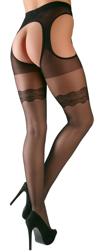 Rajstopy damskie z paskiem do pończoch i z podwiązką oplataną. Kusząco otwarte w kroku. 20 den. Certyfikat Oeko-Tex.