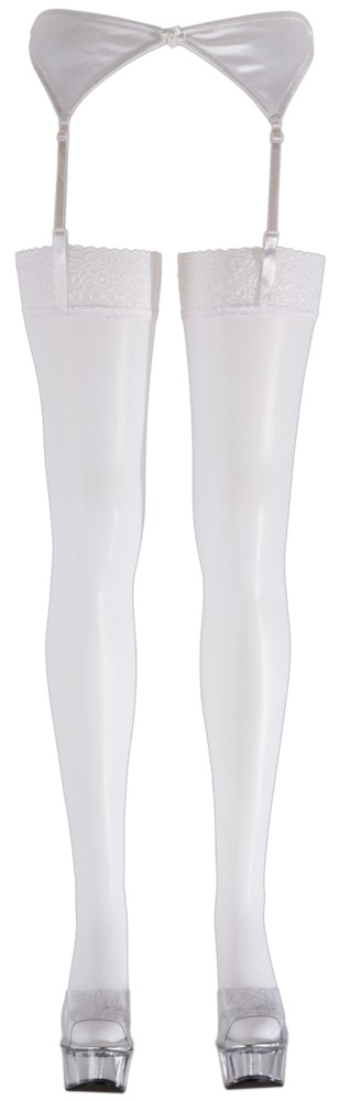 Białe pończochy z szeroką na 7 cm koronką kwiatową na górze. 20den. Certyfikat Oeko-Tex.