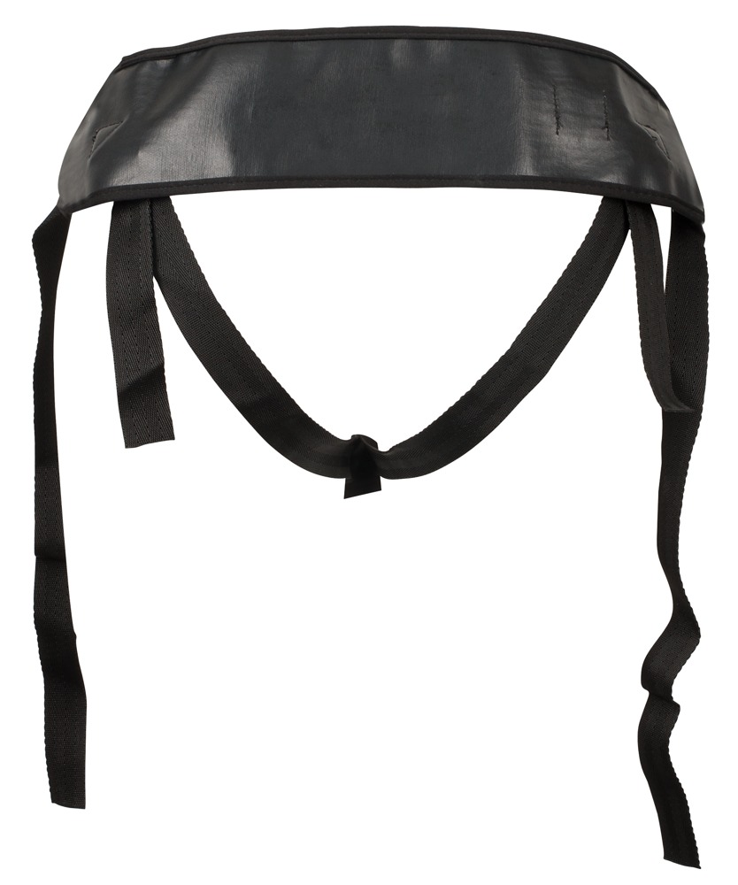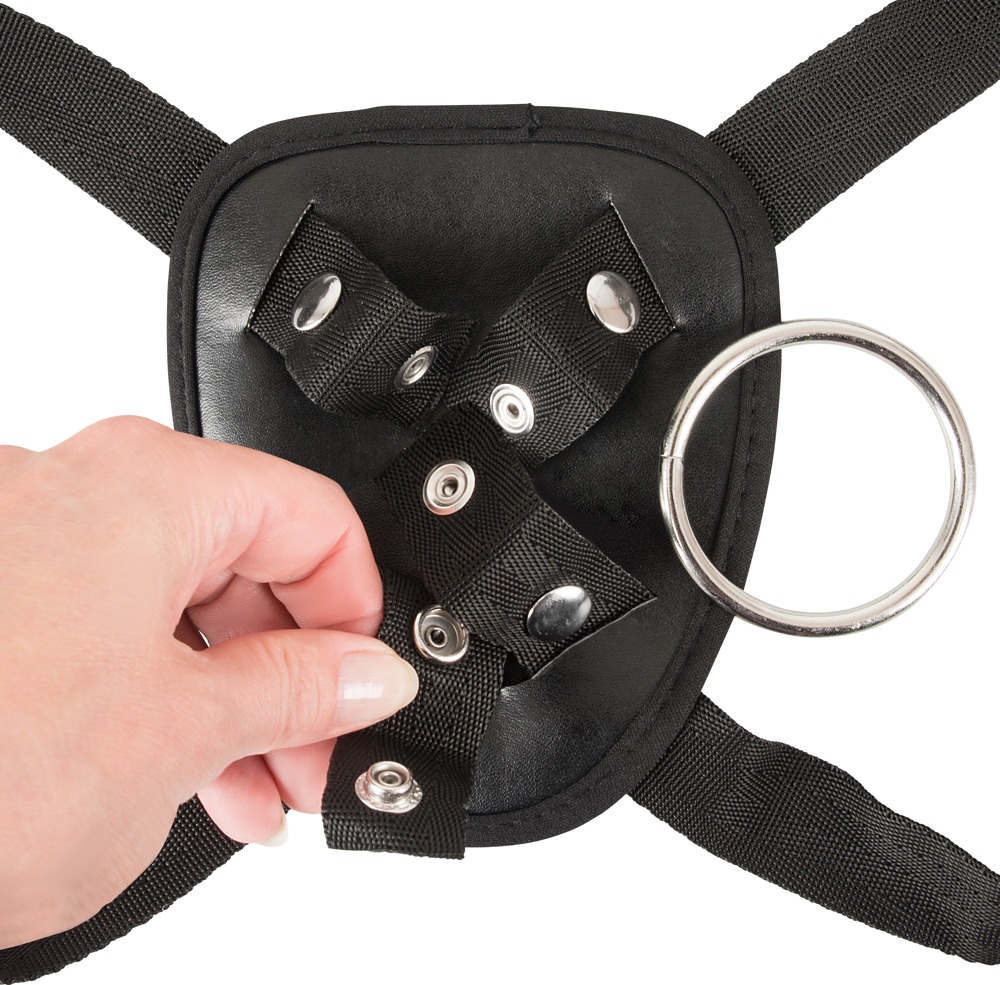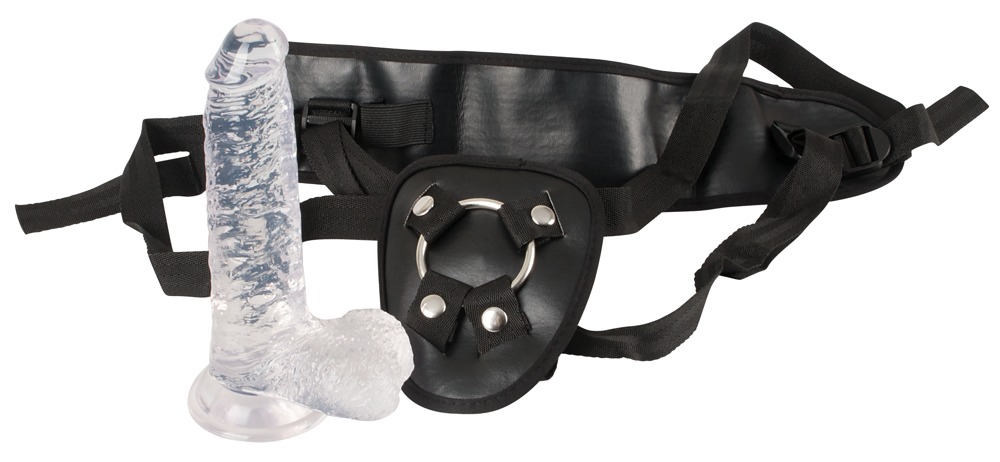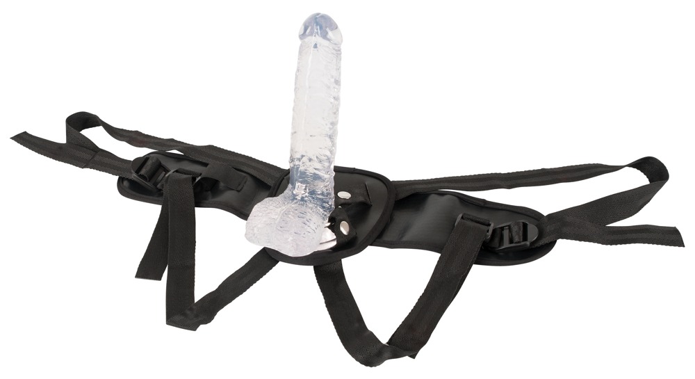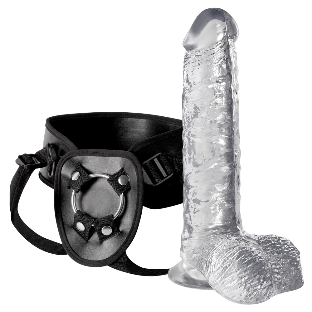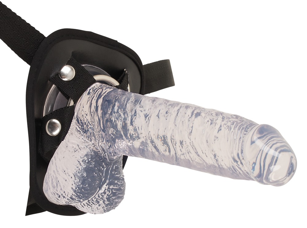 Przezroczyste penis dildo z jądrami i stopką ssącą, które można przymocować do pierścienia za pomocą regulowanego czarnego paska (obwód 60-157 cm).