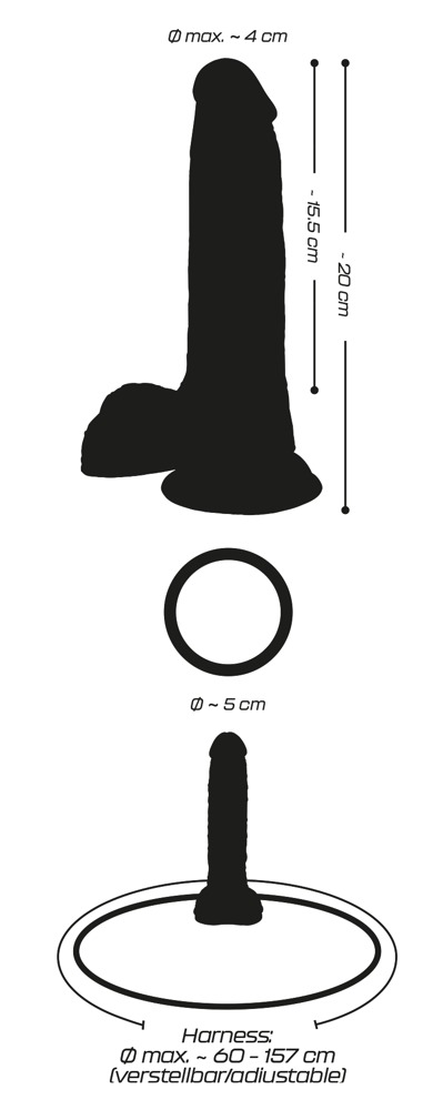 Dildo: 20 cm długości, głębokość wsunięcia 15 cm, Ø 3,2-4 cm.
