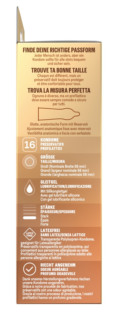Przezroczyste prezerwatywy wykonane z materiału Real Feel zapewniają naturalne uczucie skóry do skóry. Bezlateksowe i testowane dermatologicznie. Pasowanie Easy-on zapewnia lepsze dopasowanie i łatwiejsze rozwijanie. Ze zbiornikiem i powłoką chroniącą przed wilgocią. 16 kawałków.